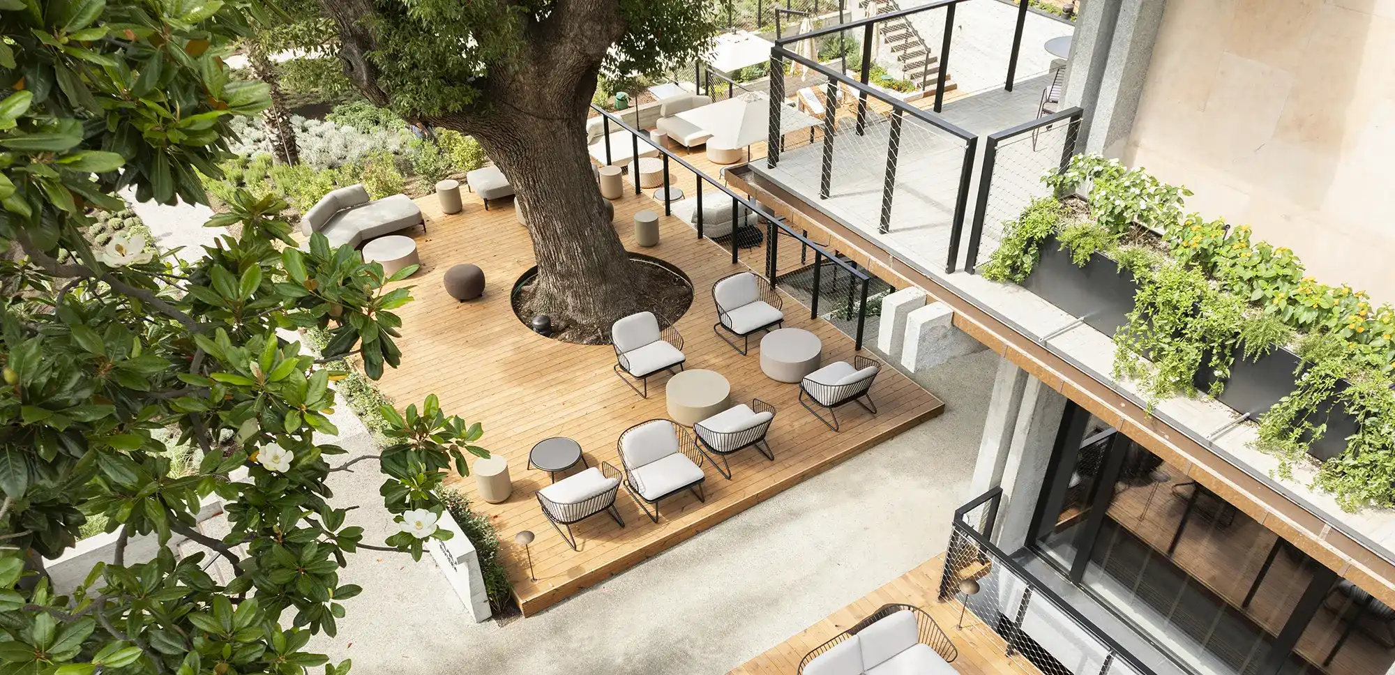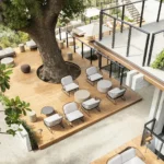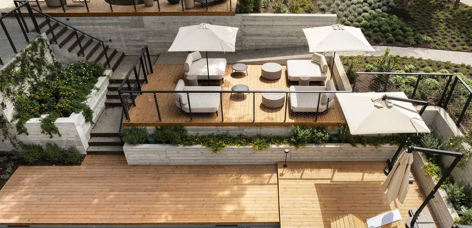 El hotel Capitolo Riviera, ubicado en Nervi, un pueblo costero elegante y pintoresco cerca de Génova (Italia), está rodeado de frondosos jardines y muy cerca del mar. Este entorno inspiró al estudio Parisotto + Formenton Architetti a la hora de diseñar este alojamiento turístico de 5 estrellas. Por ello, la madera cobró especial protagonismo en el exterior del edificio. Así, para toda la zona de terrazas se optó por un decking de pino Thermopine y, para la fachada, se instaló un sistema de control solar de Gradpanel Thermopine de la mano de Gradhermetic. Un equilibrio perfecto entre arquitectura de vanguardia y lujo mediterráneo.