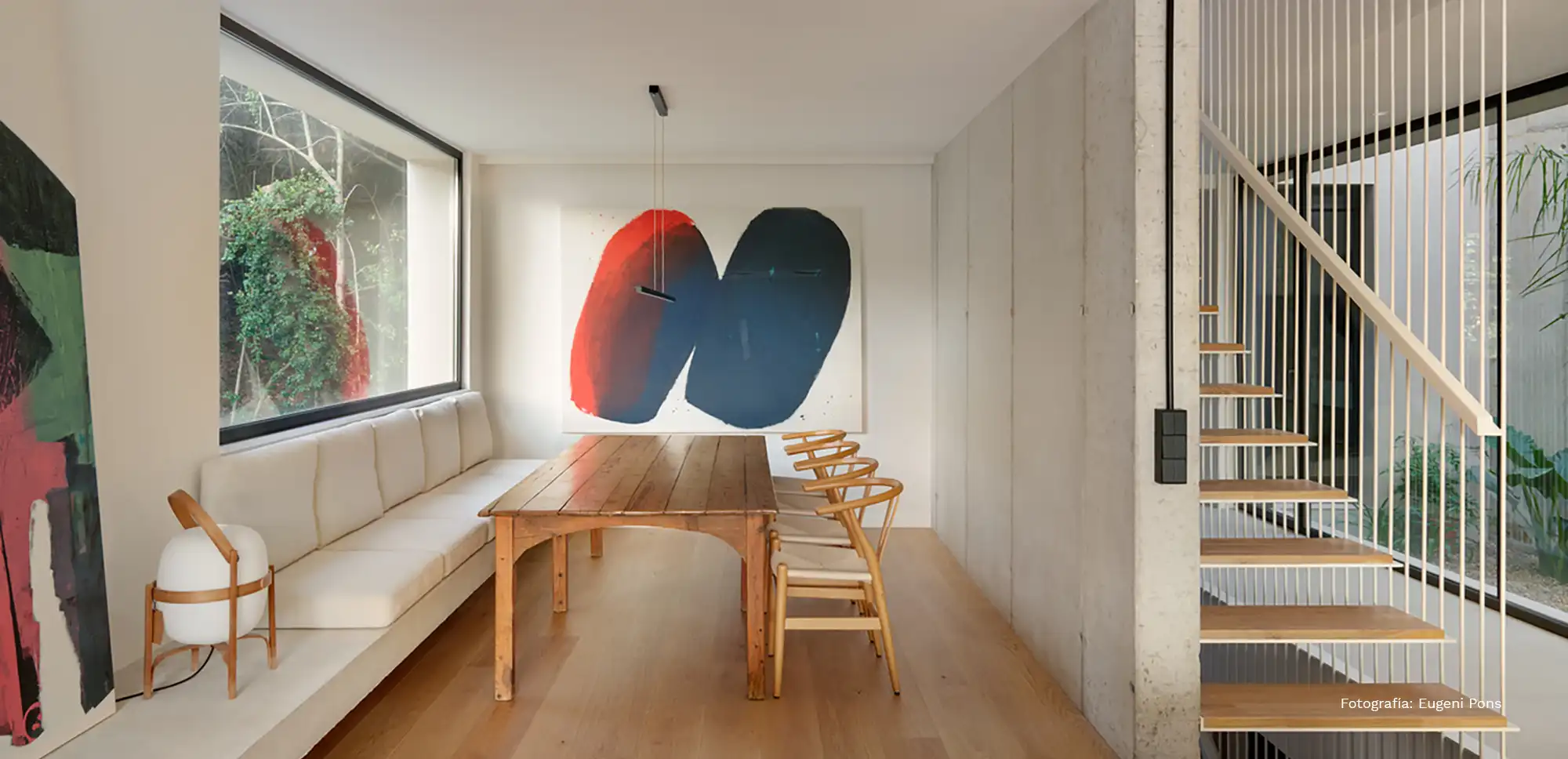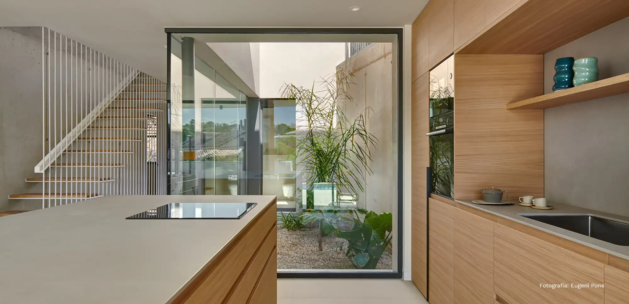 El estudio RB Arquitectura se encargó de diseñar una elegante vivienda en el municipio barcelonés de San Cugat del Vallés, un proyecto que supuso un gran reto debido al importante desnivel del terreno. Esa inclinación definió la casa, que se diseñó con una orientación suroeste de la planta noble, que se se abre al jardín con unos grande ventanales, los cuales se recubrieron con un sistema de control solar de Gradpanel Thermopine. Las lamas de pino termotratado también se usaron para revestir la fachada, tanto en la puerta de entrada como en el acceso al jardín.